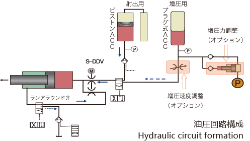 ?負荷に見合った圧力となるメータインと、速度安定に効果のあるメータアウトのそれぞれの利点を生かした「メータイン?メータアウト回路」による射出速度安定化。
