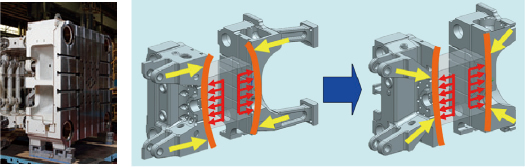 ?センタープレス方式でたわみ低減、高剛性化。型締力を金型面全体に均一に配分することにより、鋳造バリ吹き低減、低圧鋳造、型締力低減に効果を発揮。